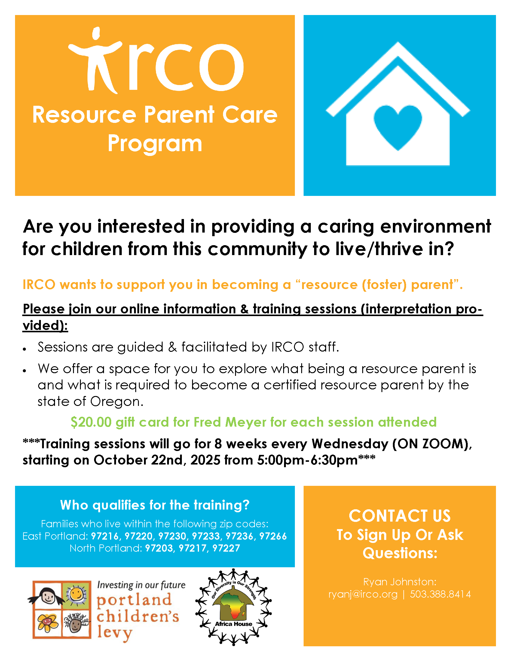 Receive a $20 Fred Meyer gift card for every session attended. See the attached flyer and contact Ryan Johnston at ryanj@irco.org or (503) 388-8414 for more info or to sign up.
