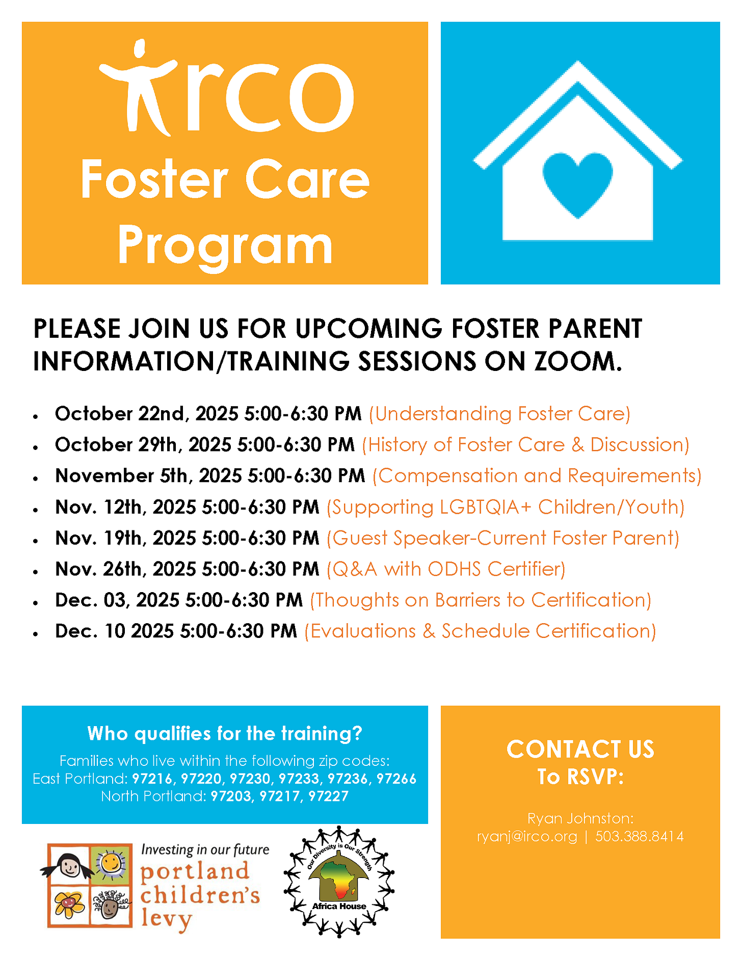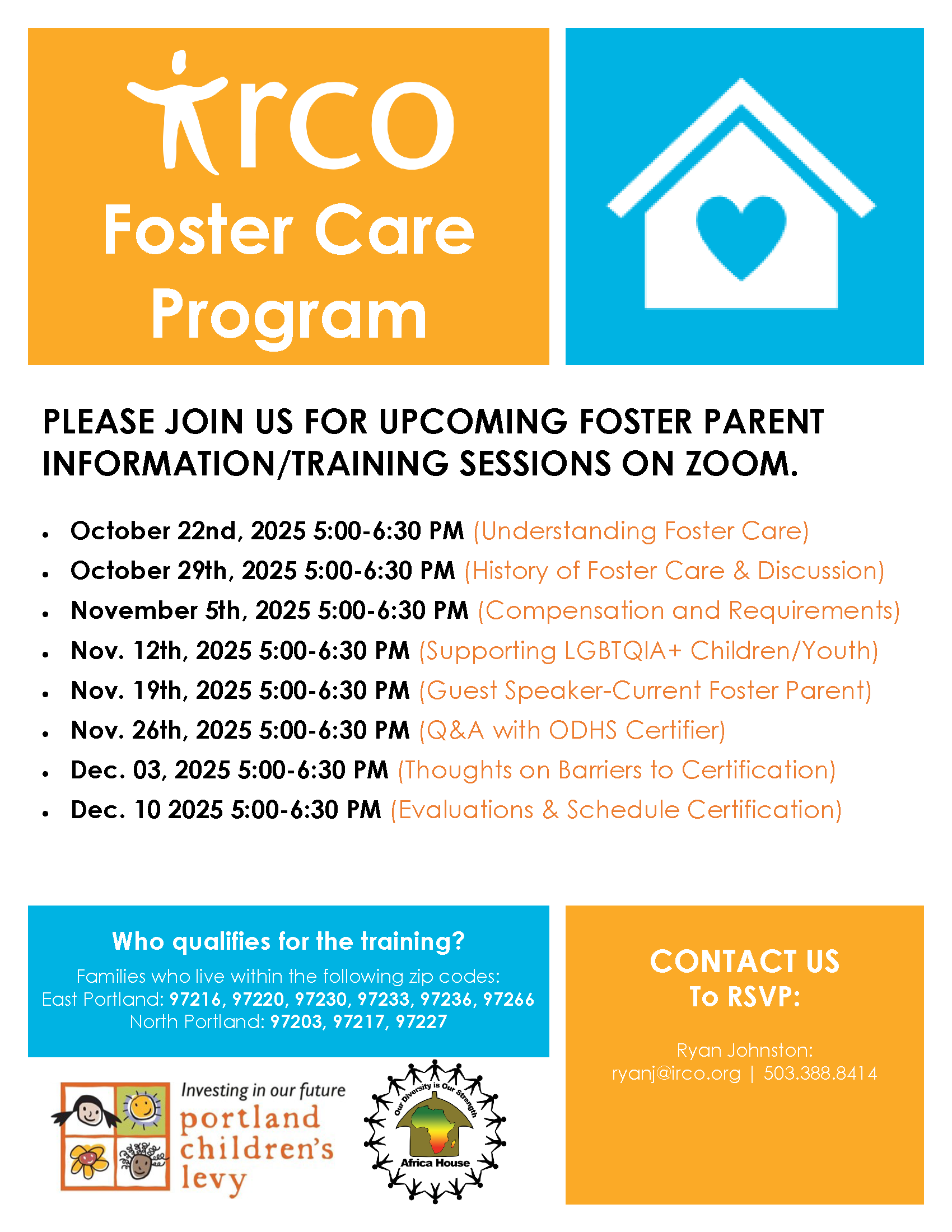 Foster Parent Training – 8-week training for families interested in providing a caring environment for children from this community. Every Wednesday on Zoom starting October 22nd from 5-6:30pm.